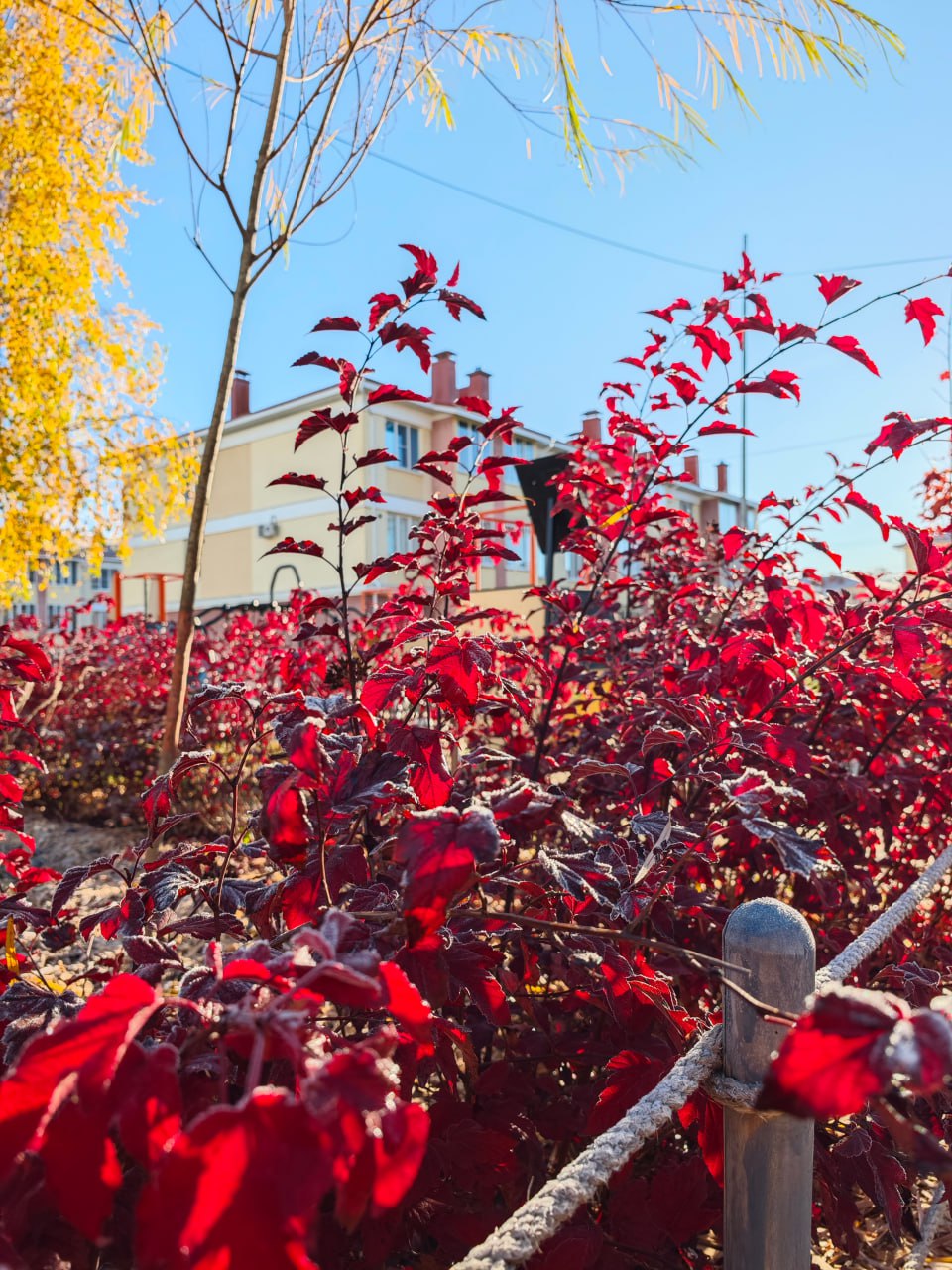 Перешли на многолетники: пузыреплодник краснолистный, спирея, ирисы. Меньше ухода, больше структуры. Плюс шесть клёнов Глобозум.